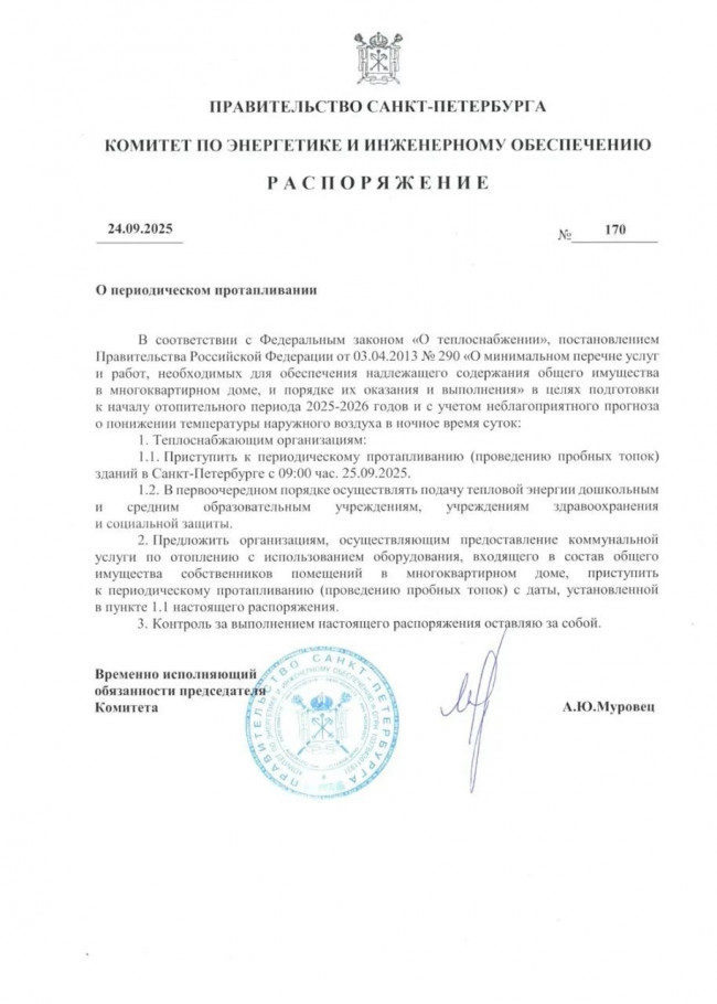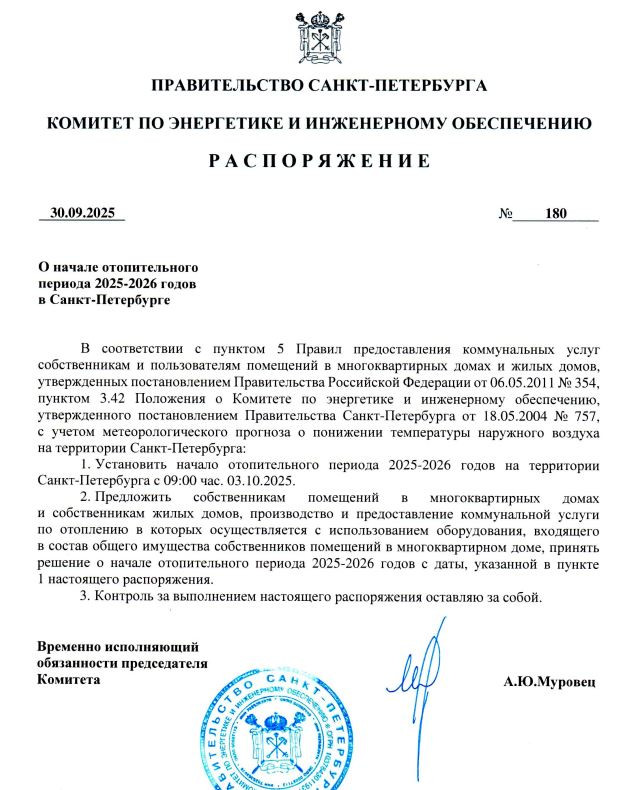 Официально в Санкт-Петербурге отопительный сезон начинается с 03.10.2025 г.