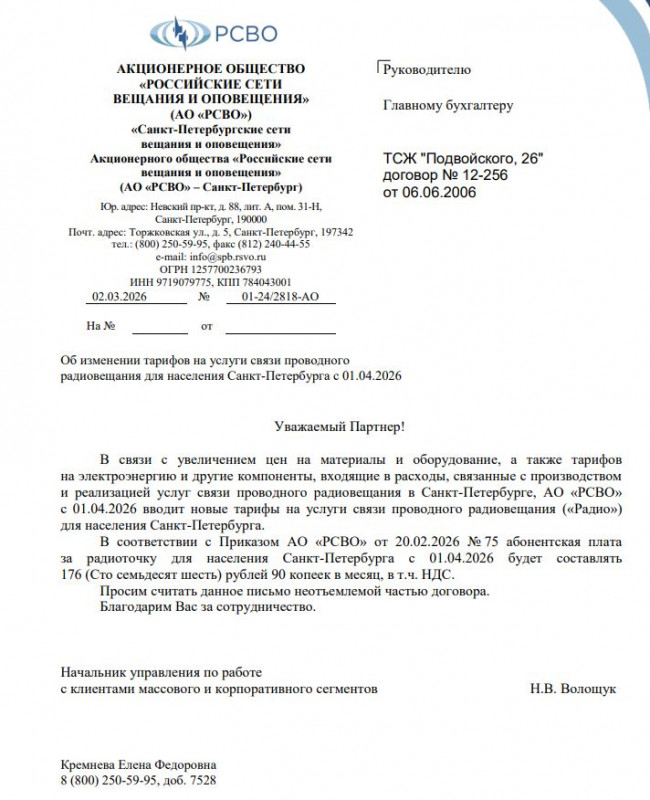 В соответствии с Приказом АО «РСВО» от 20.02.2026 № 75 абонентская плата за радиоточку для населения Санкт-Петербурга с 01.04.2026 будет составлять