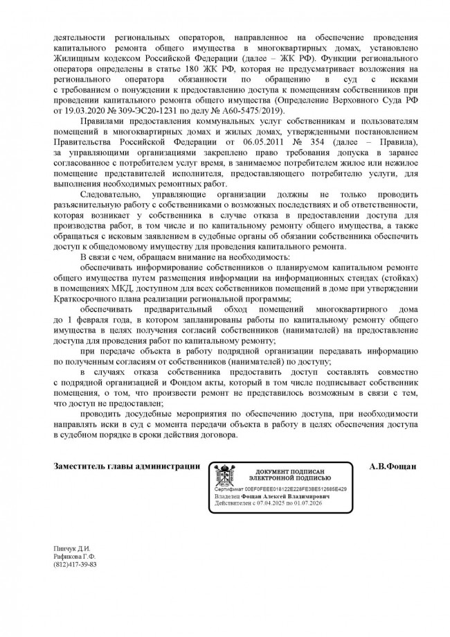 Правилами предоставления коммунальных услуг собственникам и пользователям помещений в многоквартирных домах и жилых домах, утвержденными постановлением Правительства Российской Федерации от 06.05.2011 № 354 (далее – Правила), за управляющими организациями закреплено право требования допуска в заранее согласованное с потребителем услуг время, в занимаемое потребителем жилое или нежилое помещение представителей исполнителя, предоставляющего потребителю услуги, для выполнения необходимых ремонтных работ.Управляющие организаци уполномочены проводить разъяснительную работу с собственниками о возможных последствиях и об ответственности, которая возникает у собственника в случае отказа в предоставлении доступа для производства работ, в том числе и по капитальному ремонту общего имущества, а также обращаться с исковым заявлением в судебные органы об обязании собственника обеспечить доступ к общедомовому имуществу для проведения текущего и капитального ремонта.