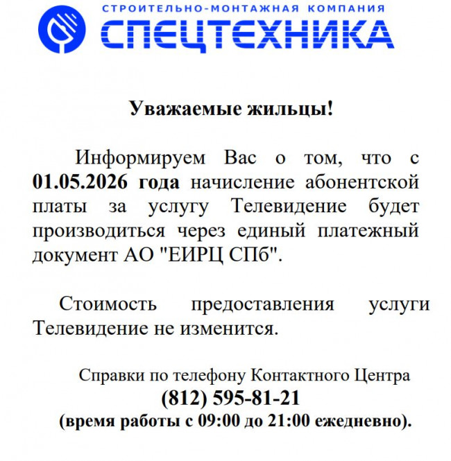 С 01.05.2026 года начисление абонентской платы за услугу Телевидение будет производиться через единый платежный документ АО "ЕИРЦ СПб".